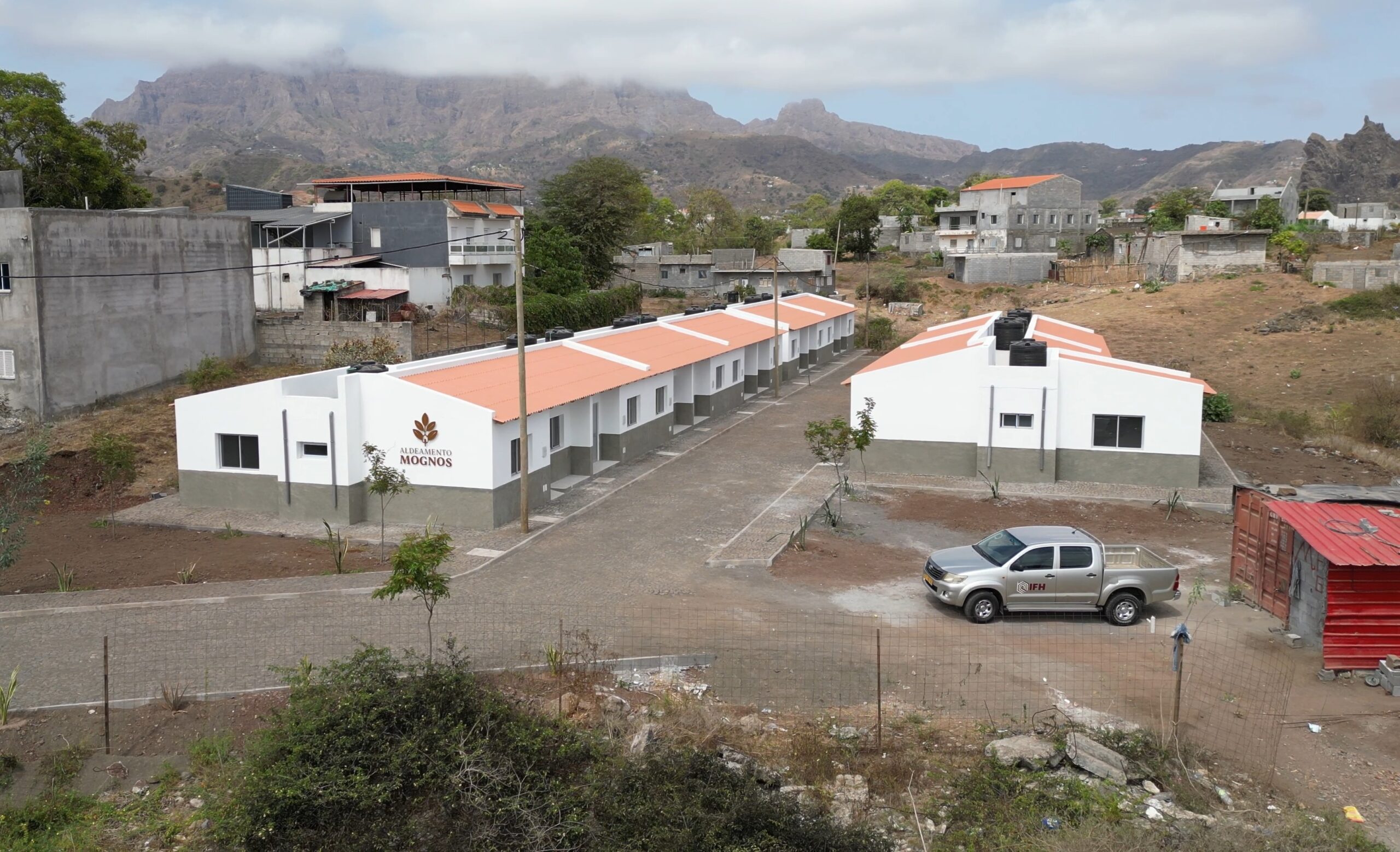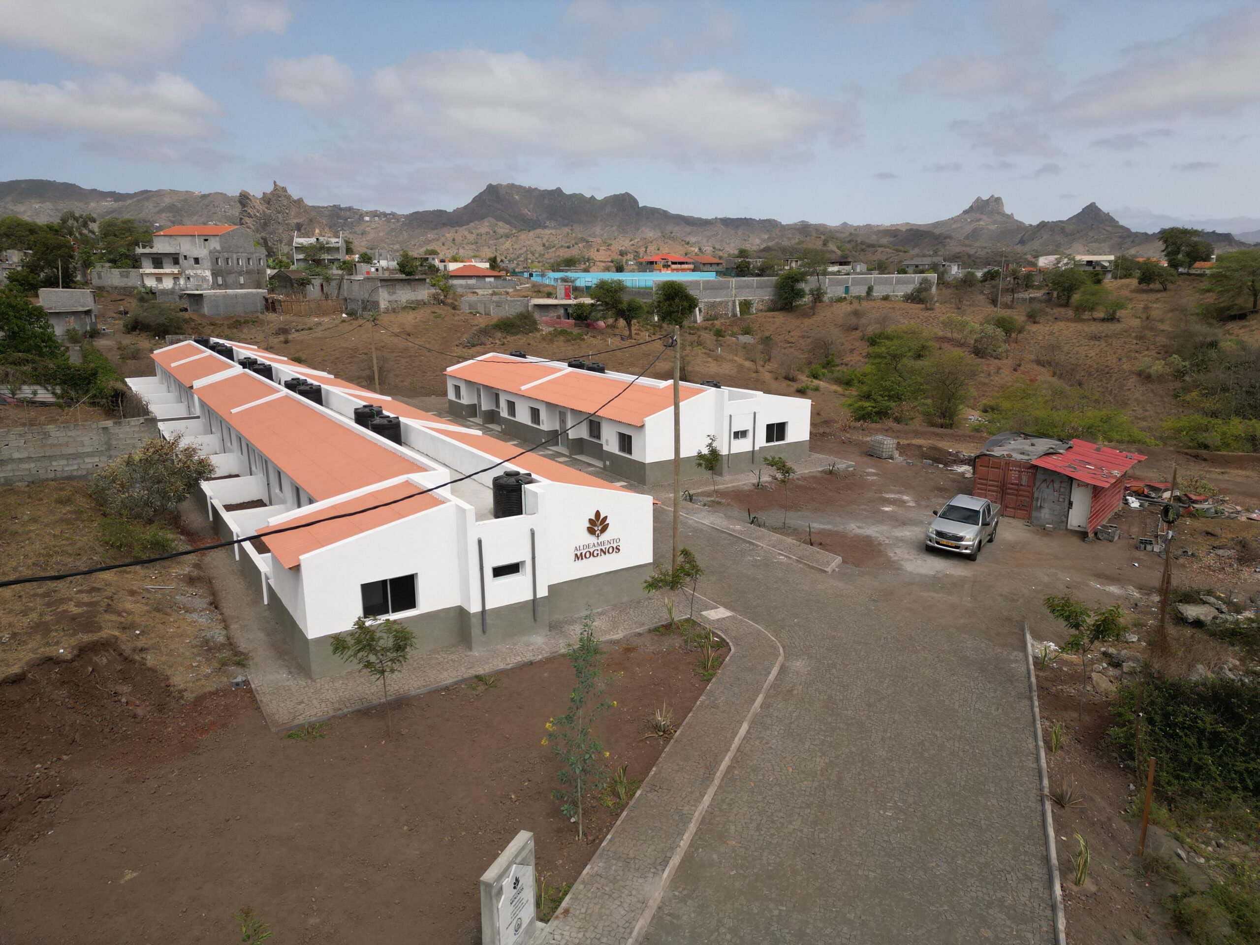 Representando um investimento de cerca de 46.225.266$81 ECV, o Aldeamento Mognos, abrange uma área de 1392m² e contempla 14 habitações apresentadas no formato de moradias individuais geminadas, organizadas em 3 blocos. Cada moradia está distribuída por uma sala comum, cozinha, dois quartos, casa-de-banho e um quintal.