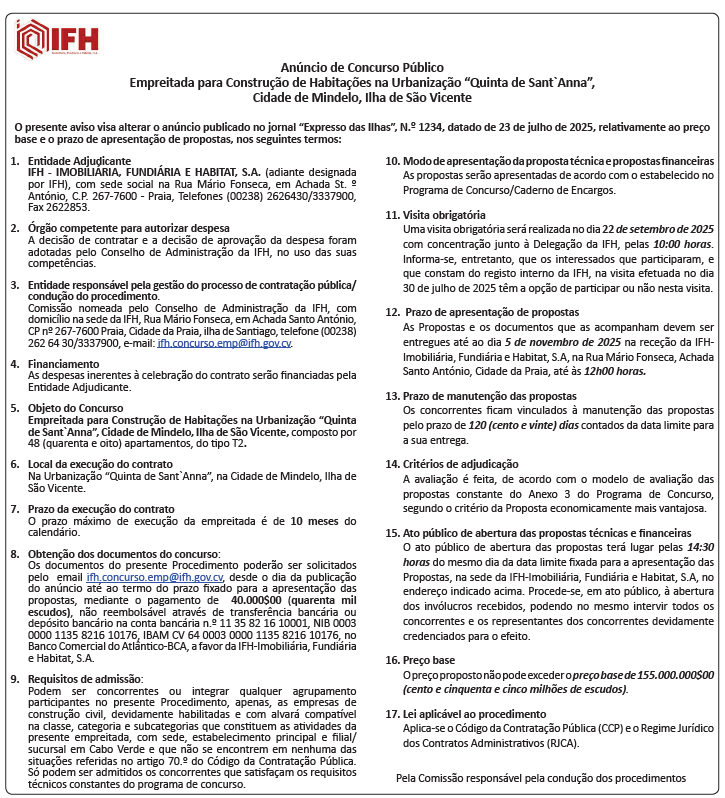 Anúncio de Concurso Público Empreitada para Construção de Habitações na Urbanização “Quinta de Sant`Anna”, Cidade de Mindelo, Ilha de São Vicente
